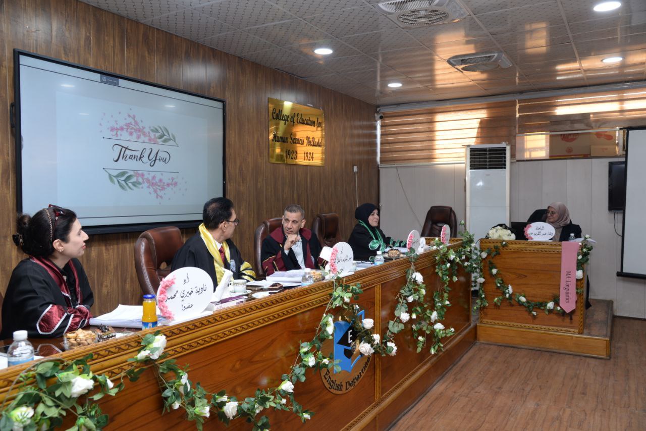 The examination committee was chaired by Prof. Dr. Abdulkarim Fadel Jameel, with Asst. Prof. Huda Abdul Ali Hattab as member and supervisor, Prof. Dr. Nadia Khairi Mohammed as member, and Prof. Dr. Mazen Jassim Mohammed joining as an external member from the College of Education for Humanities, University of Wasit.